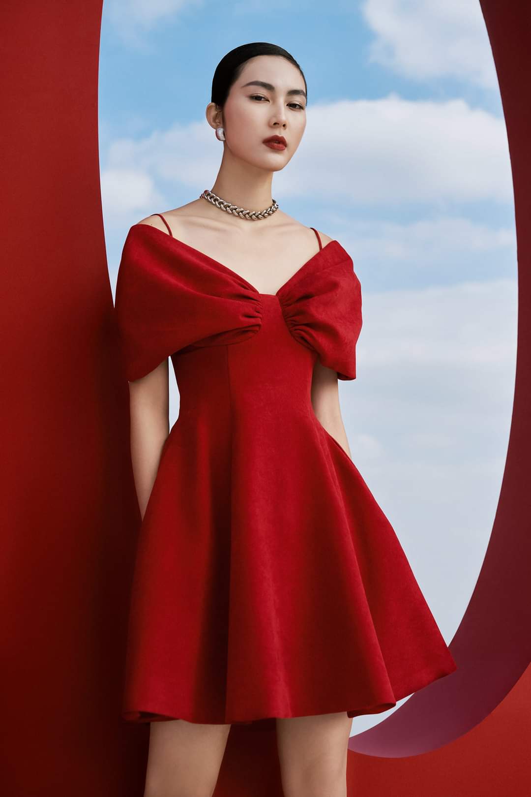 Đầm dáng xòe hai dây hở vai ngang phối nơ