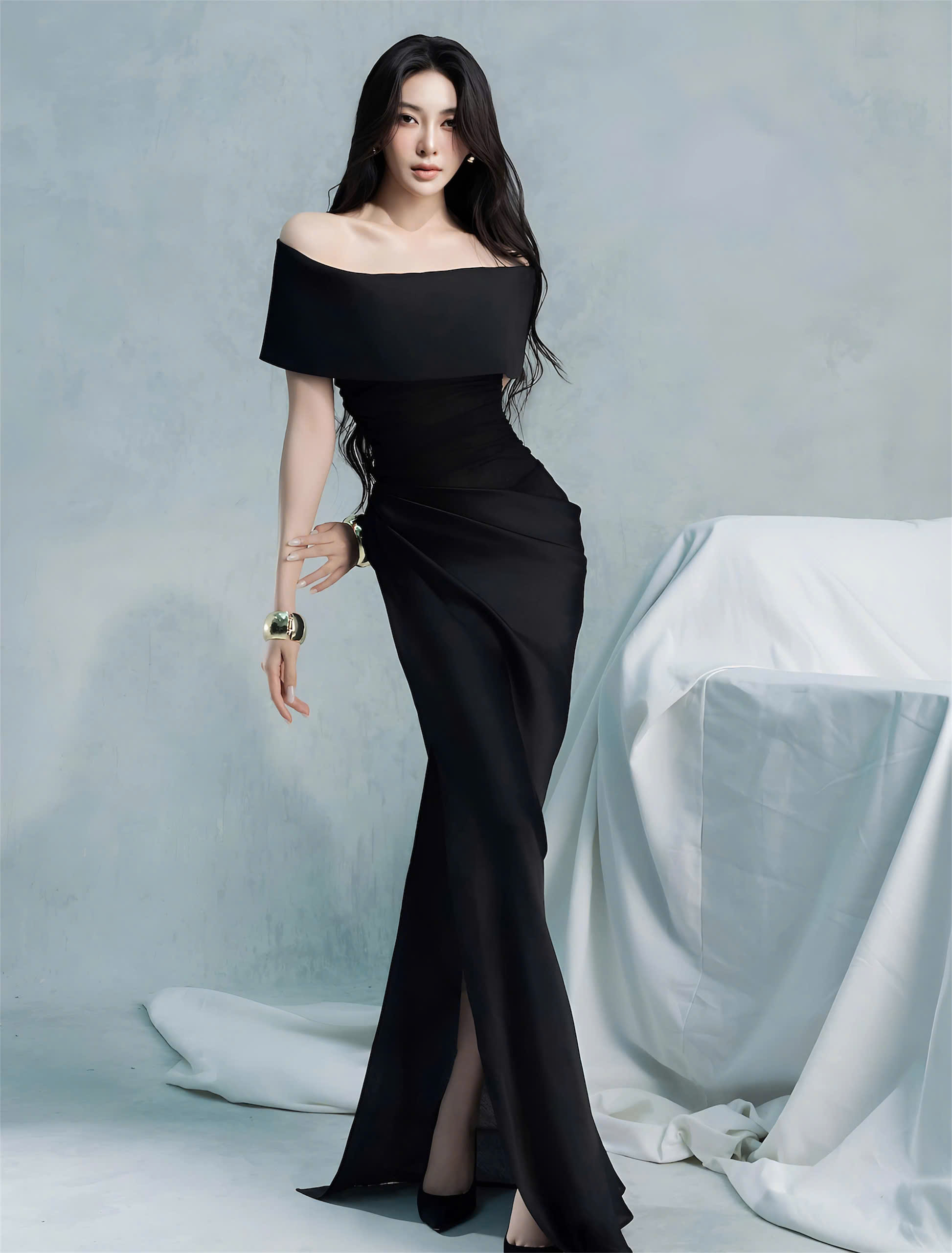Đầm dự tiệc dáng dài vai ngang xếp ly eo sang trọng