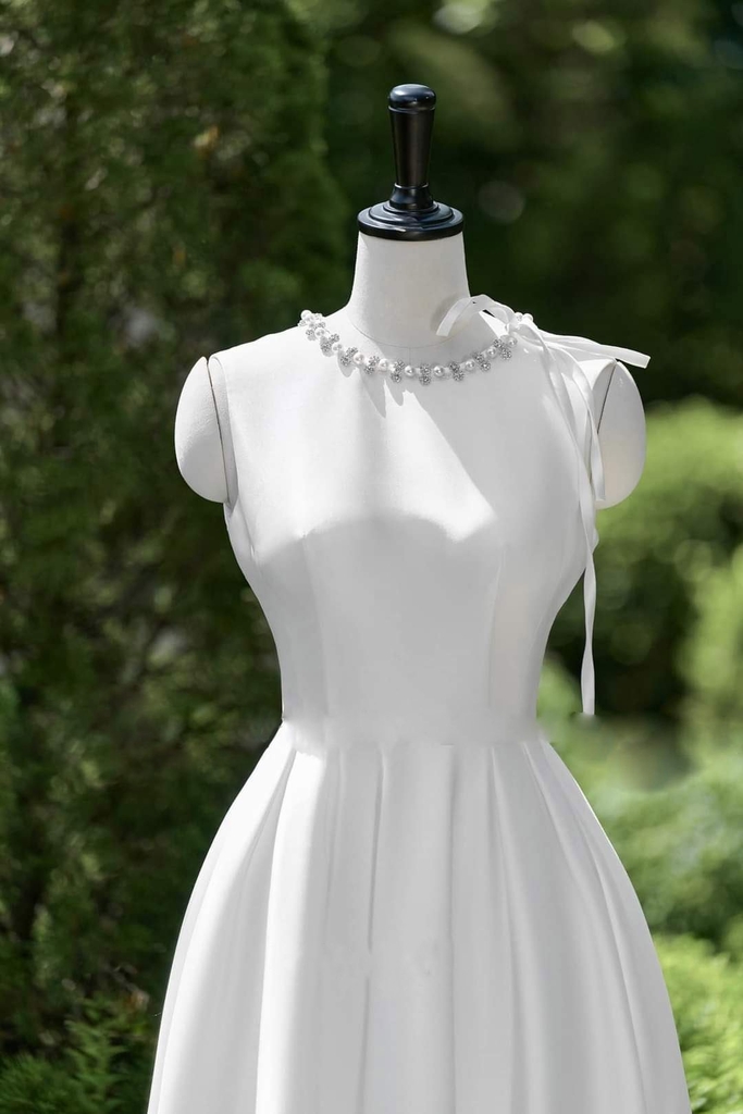 Đầm dự tiệc dáng xòe dài sát nách phối dây ngọc sang trọng