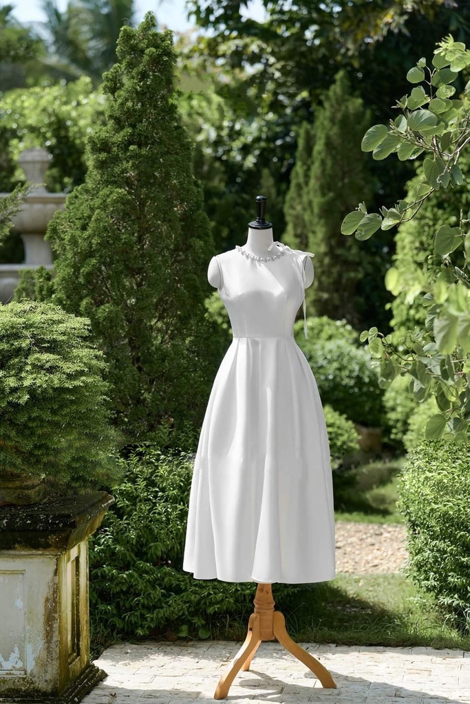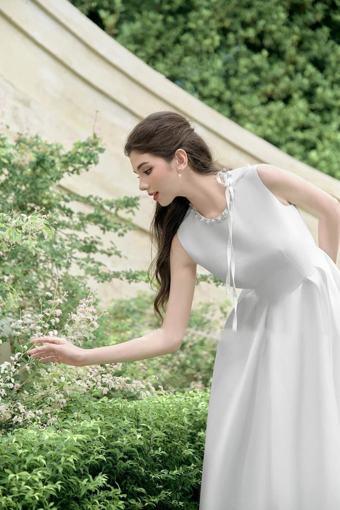 Đầm dự tiệc dáng xòe dài sát nách phối dây ngọc sang trọng Alvin Store