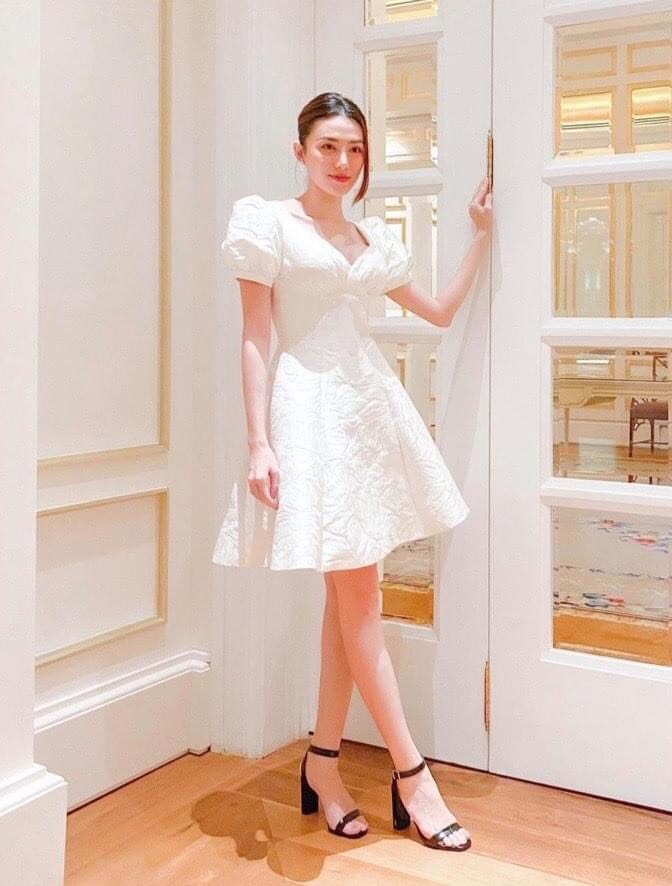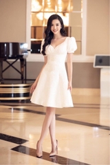 Đầm gấm xoè kiểu tay phồng cổ tim cúp ngực