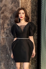 Đầm ôm body tay phồng xẻ ngực phối lưới dây ngọc eo