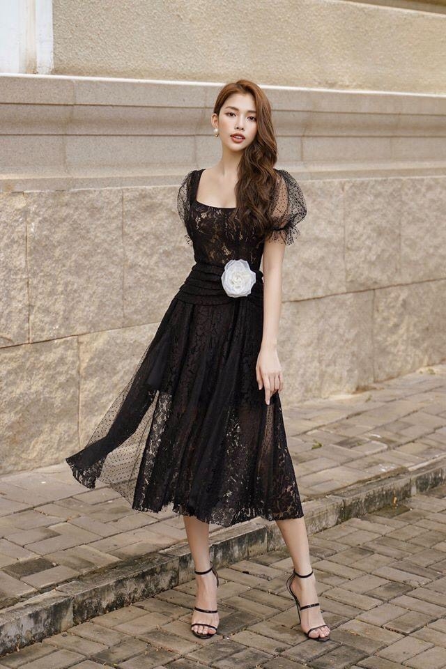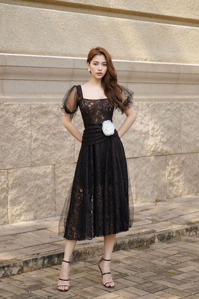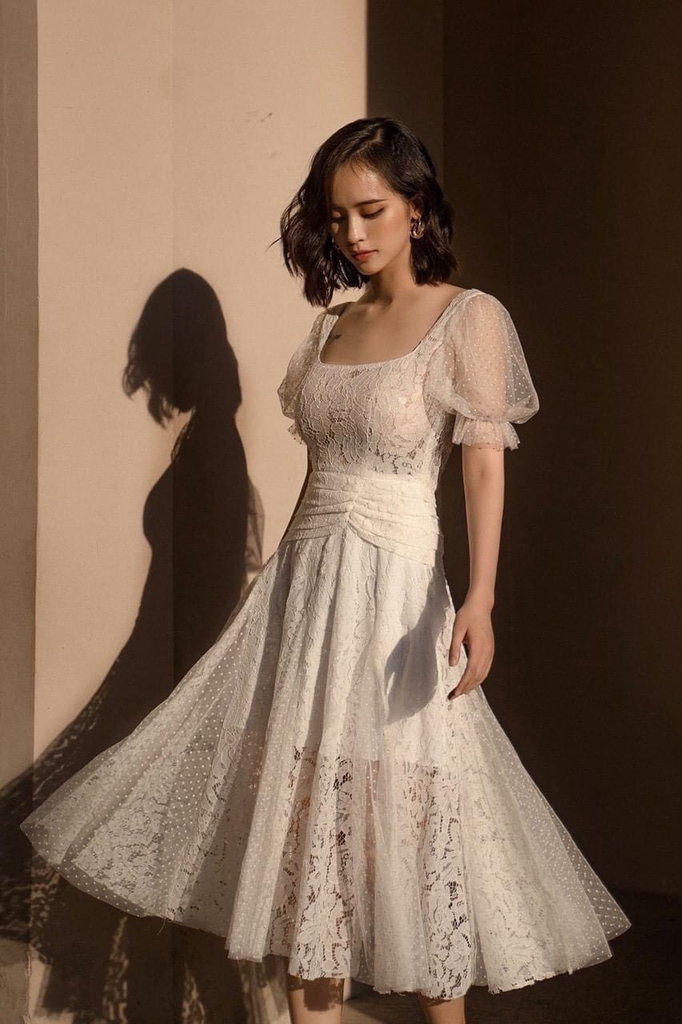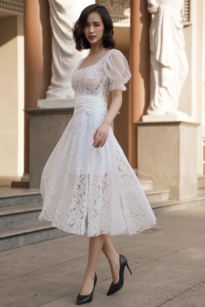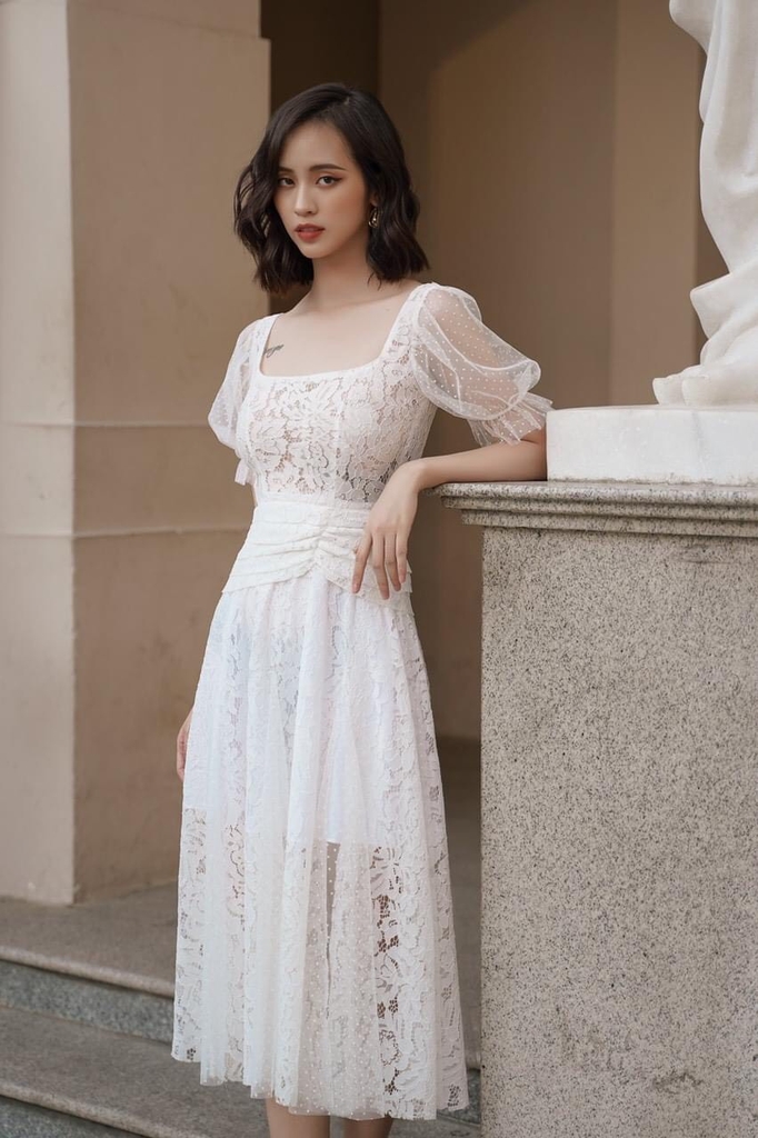 Đầm ren xoè kiểu cổ vuông tay phồng phối lưới (KHÔNG KÈM HOA)