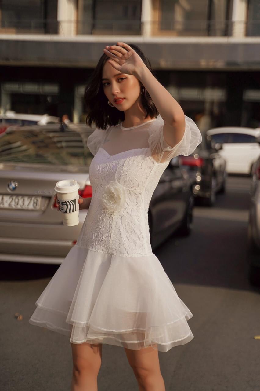 Đầm ren xoè kiểu tay con phối lưới đính hoa eo