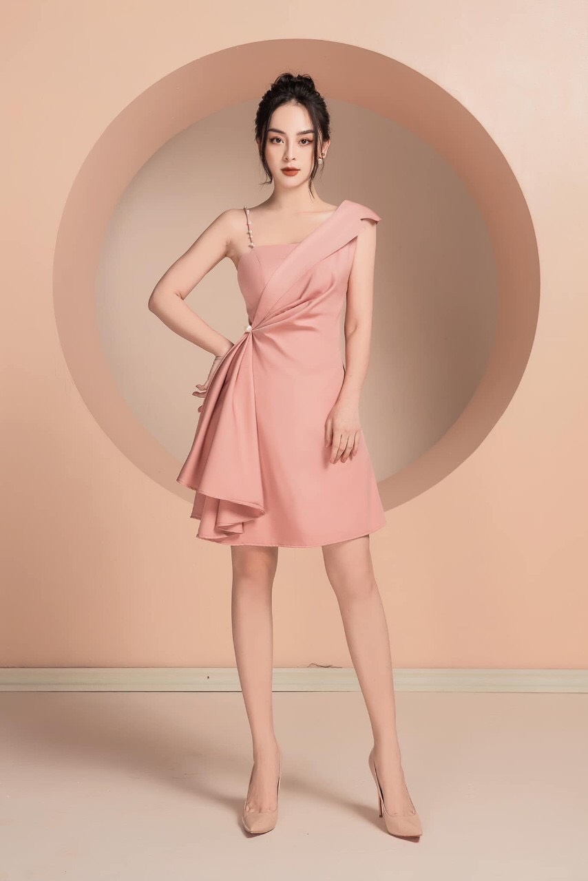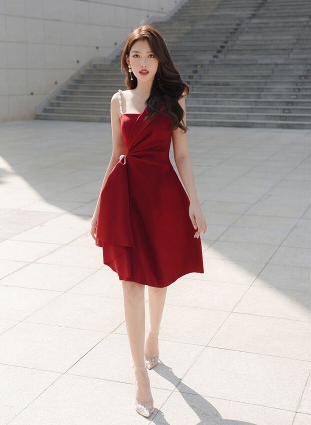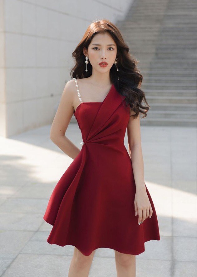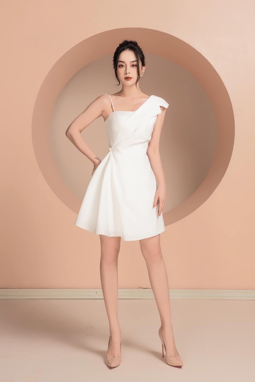 Đầm xòe kiểu lệch vai phối dây ngọc nhún eo