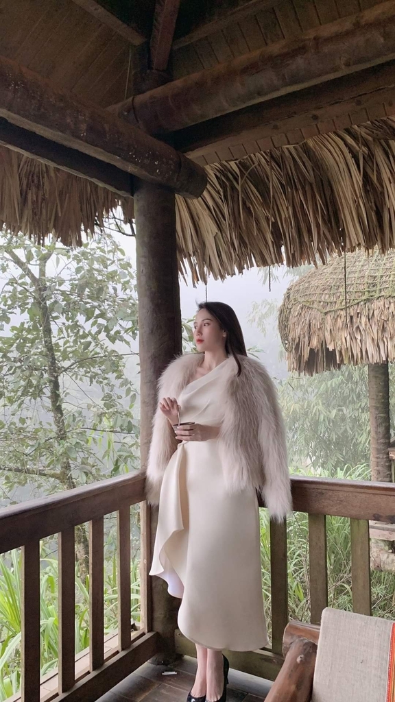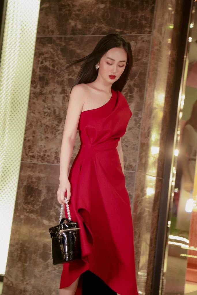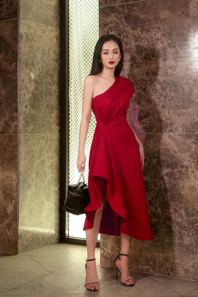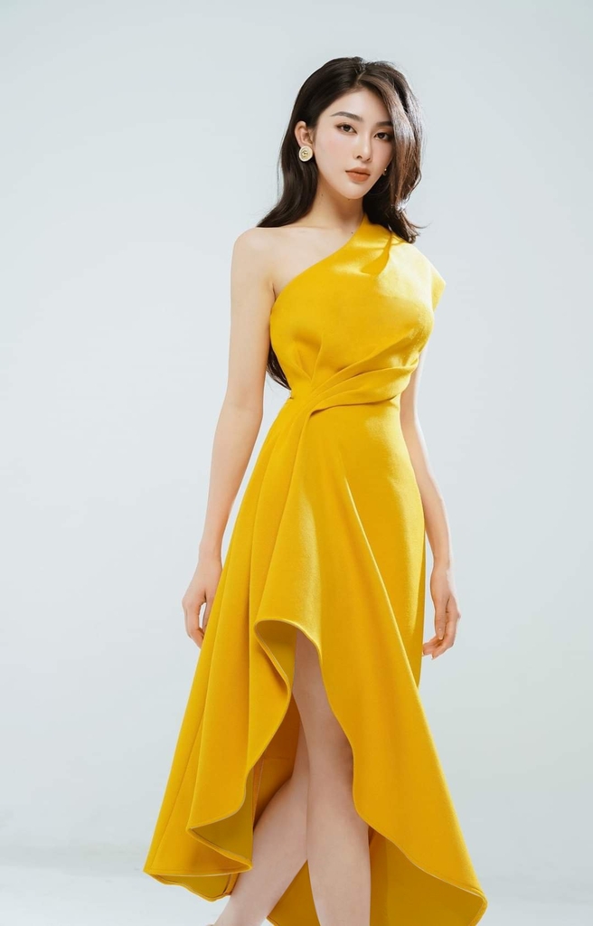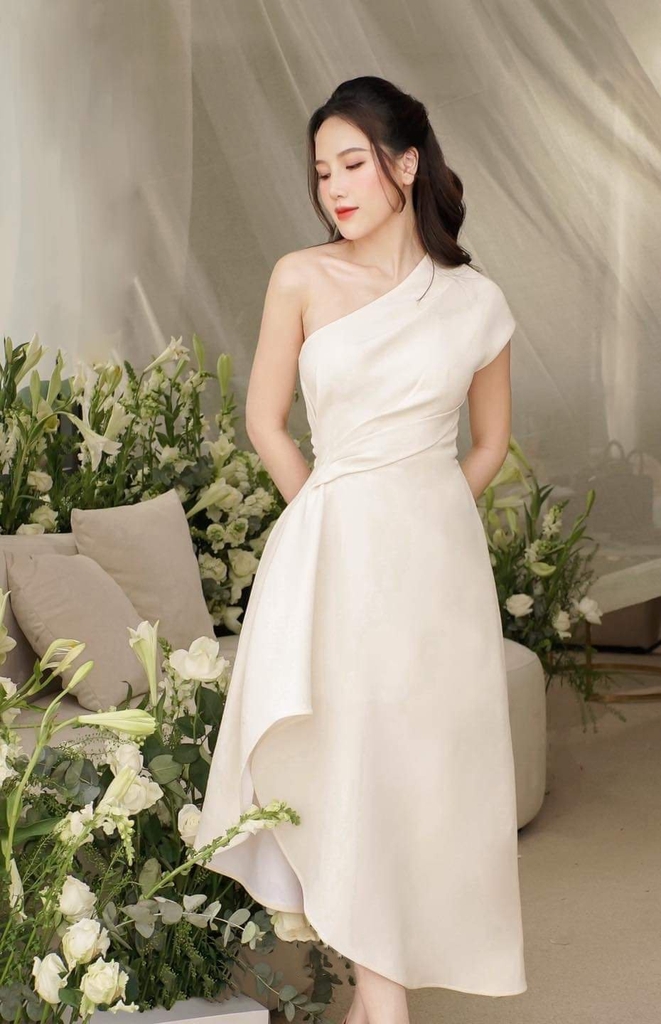 Đầm xòe kiểu lệch vai xếp ly eo xéo tà