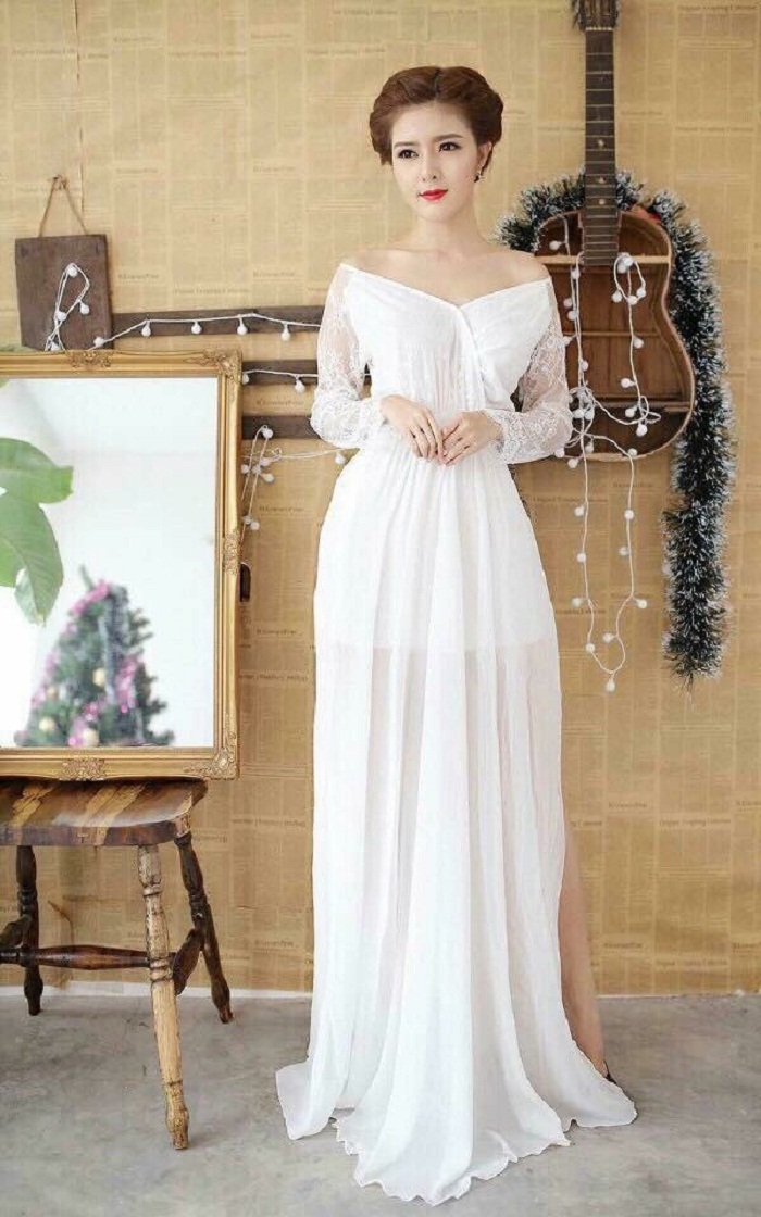 Đầm maxi kiểu tay dài hở vai phối ren--Mã sản phẩm: 1011--480.000₫