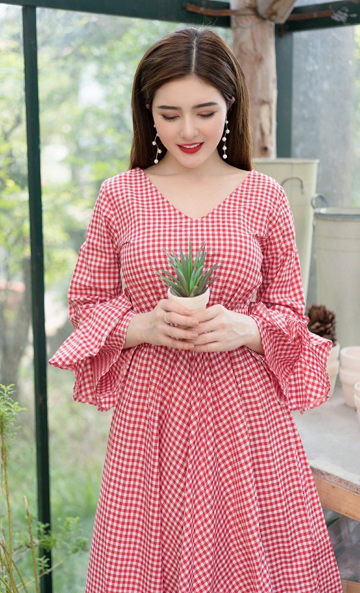Đầm xoè kiểu tay loe cổ V caro trẻ trung--Mã: 1109--460.000₫