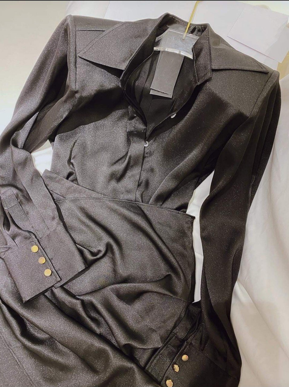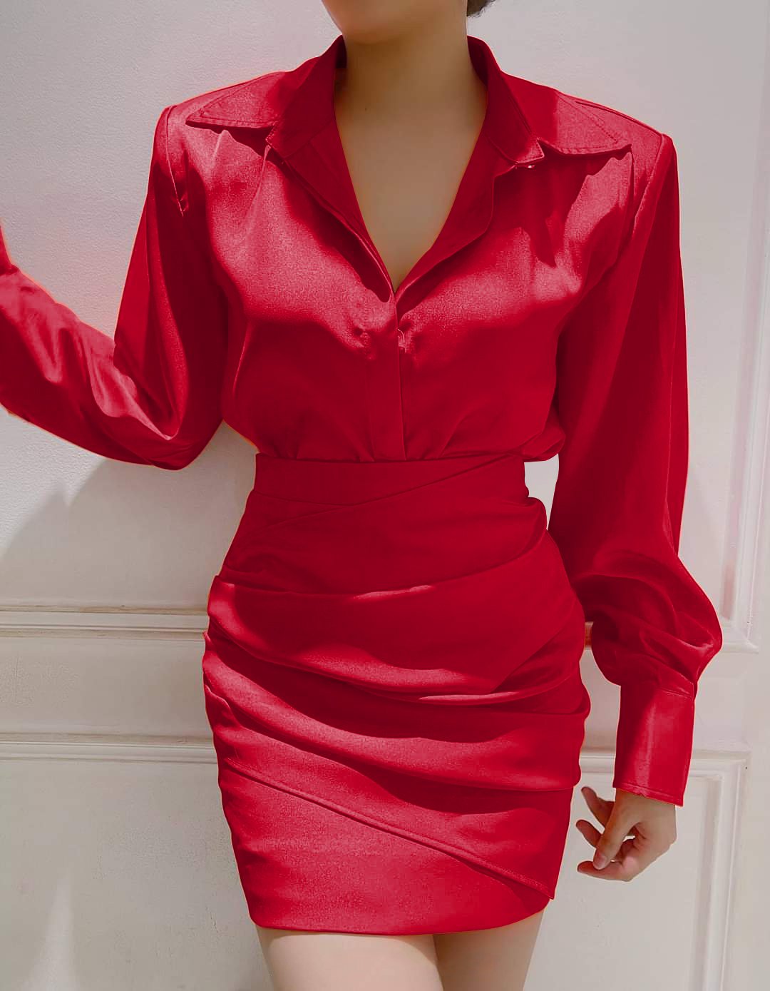 Set áo váy kiểu áo sơmi tay dài phối chân váy ôm ngắn